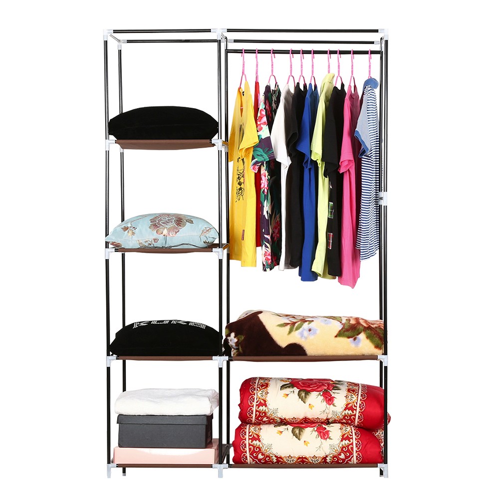 · Práctico ropero plegable de tela con dos divisiones verticales, dispone de un amplio espacio diseñado para colgar perchas y 6 estantes.